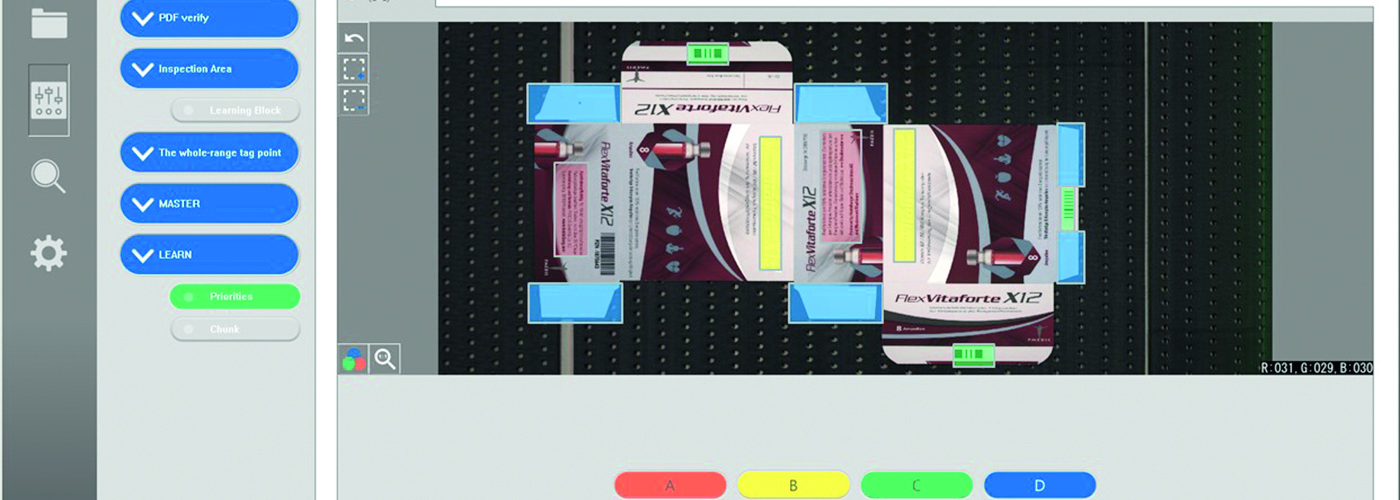- Инспекционная система осуществляет контроль качества как в целом по рабочему полю, так и по отдельно заданным зонам с различными требованиями по качеству в разных зонах. Например, в полях клеевых клапанов могут допускаться марашки, красочные пятна и другие дефекты, недопустимые на рабочих поверхностях упаковки.
